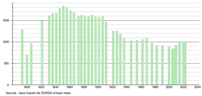 L'évolution du nombre d'habitants est connue à travers les recensements de la population effectués dans la commune depuis 1793. Pour les communes de moins de 10 000 habitants, une enquête de recensement portant sur toute la population est réalisée tous les cinq ans, les populations de référence des années intermédiaires étant quant à elles estimées par interpolation ou extrapolation[23]. Pour la commune, le premier recensement exhaustif entrant dans le cadre du nouveau dispositif a été réalisé en 2004[24].