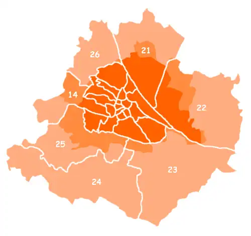 Vienne se divise politiquement en 23 arrondissements (Bezirke). Les Viennois les désignent soit par leur nom soit par leur numéro (« 17e arrondissement », « le 17e » ou « Hernals »). Ces numéros sont inscrits sur tous les panneaux indicatifs des noms de rues (par exemple « 17., Pezzlgasse ») et forment le deuxième et le troisième chiffre du code postal (« 1010 » correspond donc au premier arrondissement, « 1220 » au 22e, quelques exceptions concernent le 23e). En langage familier, il est possible d'utiliser le mot Hieb (« coup ») au lieu de Bezirk (« arrondissement »).