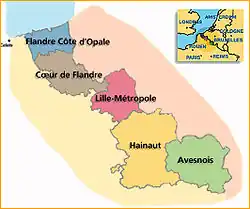 L'arrondissement de Dunkerque correspond à la Flandre maritime, ceux de Lille et de Douai correspondent peu ou prou à la Flandre wallonne, celui de Cambrai grosso modo au Cambrésis et ceux de Valenciennes et d'Avesnes-sur-Helpe approximativement à la partie française du Hainaut, dont le pays Avesnois.