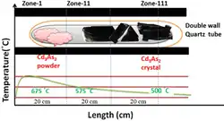 L'arséniure de cadmium peut être préparé sous forme de verre semi-conducteur amorphe. Selon Hiscocks et Elliot[5], la première préparation de l'arséniure de cadmium fut faite à partir de cadmium métallique, avec une pureté de 6 N et fourni par Kock-Light Laboratories Limited, tandis que Hoboken a fourni l'arsenic β avec une pureté de 99,999 %. Des proportions stœchiométriques des éléments cadmium et arsenic furent chauffées ensemble. La séparation fut difficile et longue en raison du collage des lingots à la silice et aux cassures. La méthode de croissance Stockbarger encapsulée dans un liquide a été retenue. Les cristaux sont tirés depuis le bain volatil en encapsulation liquide. Le bain est couvert par une couche de liquide inerte, habituellement B2O3, et une pression de gaz inerte supérieure à la pression de vapeur d'équilibre est appliquée. Cela élimine l'évaporation du bain, et permet d'effectuer l'ensemencement et le tirage à travers la couche de B2O3.