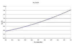 Le paramètre cristallin de InGaAs augmente linéairement avec la concentration de InAs dans l'alliage[8]. Le diagramme de phase liquide-solide[4] montre que lors de la solidification à partir d'une solution contenant du GaAs et du InAs, GaAs est incorporé beaucoup plus rapidement que InAs, appauvrissant la solution en GaAs. Lors de la croissance d'un lingot à partir d'une solution, la composition du premier matériau à solidifier est riche en GaAs tandis que le dernier matériau à solidifier est enrichi en InAs. Cette caractéristique a été exploitée pour produire des lingots de InGaAs avec un gradient de composition selon la longueur du lingot. Cependant, les déformations introduites par le paramètre cristallin variable fait que le lingot est polycristallin et limite la caractérisation à quelques paramètres, tels que la bande interdite et le paramètre cristallin avec des incertitudes dues au gradient de composition dans ces échantillons.