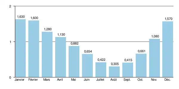 Le débit instantané maximal enregistré durant cette période a été de 14,9 m3/s le , correspondant à une hauteur de 1,03 mètre. La valeur journalière maximale du débit a atteint 10,7 m3/s le [2].