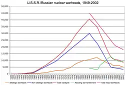 Malgré les traités de désarmement signés par Gorbatchev, elle comptait encore 1 054 missiles intercontinentaux et 4 278 têtes nucléaire en 1990[12].