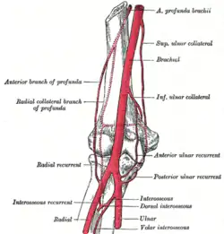 Peu après sa naissance, l'artère radiale donne l'artère récurrente radiale qui s'anastomose avec la branche antérieure de l'artère collatérale externe du bras.