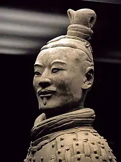 Sur plus de six cents fosses[34] de toutes tailles détectées[N 18], l'armée de terre, contenue dans huit fosses[35], ne constituerait donc qu'un élément de ce complexe énorme. Cette armée, à taille humaine (entre 1,75 et 1,85 m) est sortie des mains d'une « armée » de modeleurs expérimentés en coroplathie (ou coroplastie) qui ont utilisé des moules pour un grand nombre de parties. Les visages et les mains, en revanche, individualisés et détaillés, donnent l'impression d'une multitude de « portraits » expressifs, comme on peut le voir dans l'image d'un officier de l'armée de terre cuite. Ces statues, après séchage et cuisson à 1 000 °C dans une atmosphère réductrice, étaient mises en couleurs, des couleurs claires et vives mais qui disparaissent très rapidement à la lumière du jour[N 19]