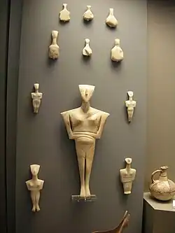 Les formes les plus connues de cette période sont des objets de marbre généralement nommés « idoles » ou « figurines », bien qu'aucune des deux appellations ne soit tout à fait juste. Le premier terme suggère une fonction religieuse laquelle n'est pas du tout accordée par l'ensemble des experts et le second ne peut pas s'appliquer aux larges figures qui sont presque de grandeur nature. Ces figurines de marbre que l'on retrouve dispersées autour de la mer Égée suggèrent qu'elles étaient populaires parmi les peuples de la Crète et de la Grèce continentale[4]. Les plus célèbres de ces figurines sont peut-être celles de musiciens : un joueur de harpe et un autre joueur de pipeau[5]. Datés approximativement vers 2500 av. J.-C., ces musiciens sont parfois considérés comme « les plus anciennes représentations existantes de musiciens de la civilisation égéenne. »[6]