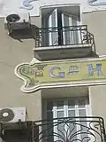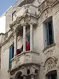 Les balcons des trois étages sont liés par des colonnes torses en marbre rose et couronnés par des chapiteaux à motifs floraux[9]. Les motifs ondoyants des ferronneries des balcons sont caractéristiques de l'Art nouveau[9]. Les baies du dernier étage ont des impostes en mosaïque représentant un bouquet de bleuets[9].
