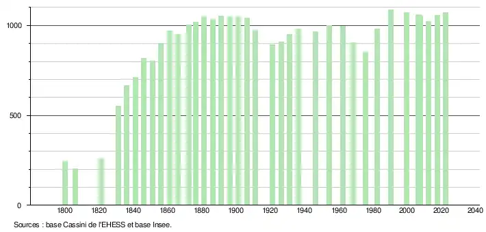 L'évolution du nombre d'habitants est connue à travers les recensements de la population effectués dans la commune depuis 1800. Pour les communes de moins de 10 000 habitants, une enquête de recensement portant sur toute la population est réalisée tous les cinq ans, les populations de référence des années intermédiaires étant quant à elles estimées par interpolation ou extrapolation[23]. Pour la commune, le premier recensement exhaustif entrant dans le cadre du nouveau dispositif a été réalisé en 2007[24].