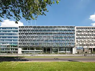 L'immeuble reprend les codes du mouvement moderniste : des lignes géométriques pures, une répartition fonctionnelle et l'emploi de techniques nouvelles. La façade du côté de l'avenue des Arts est celle qui exprime le plus le style moderne. Elle est composée de deux parties : un soubassement qui concerne uniquement le rez-de-chaussée d’accueil et les étages où l’on trouve les bureaux. Les deux parties se différencient totalement par leur traitement en façade.