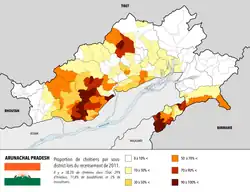Toujours selon le recensement indien de 2011, les chrétiens sont le premier groupe religieux de l'État avec 30,3% de la population (418 732 adeptes) suivi de près par les hindouistes (29% - 401 876 hab.). Le bouddhisme rassemble 11,8% de la population (162 815 personnes) et les musulmans seulement 2%. Enfin, les autres religions (principalement Donyi-Polo, animisme et chamanisme) et les non croyants regroupent 27% des habitants (373 259 pers.)