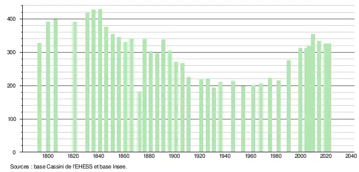 L'évolution du nombre d'habitants est connue à travers les recensements de la population effectués dans la commune depuis 1793. Pour les communes de moins de 10 000 habitants, une enquête de recensement portant sur toute la population est réalisée tous les cinq ans, les populations de référence des années intermédiaires étant quant à elles estimées par interpolation ou extrapolation[32]. Pour la commune, le premier recensement exhaustif entrant dans le cadre du nouveau dispositif a été réalisé en 2004[33].
