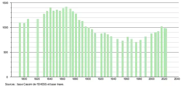 L'évolution du nombre d'habitants est connue à travers les recensements de la population effectués dans la commune depuis 1793. Pour les communes de moins de 10 000 habitants, une enquête de recensement portant sur toute la population est réalisée tous les cinq ans, les populations de référence des années intermédiaires étant quant à elles estimées par interpolation ou extrapolation[18]. Pour la commune, le premier recensement exhaustif entrant dans le cadre du nouveau dispositif a été réalisé en 2005[19].