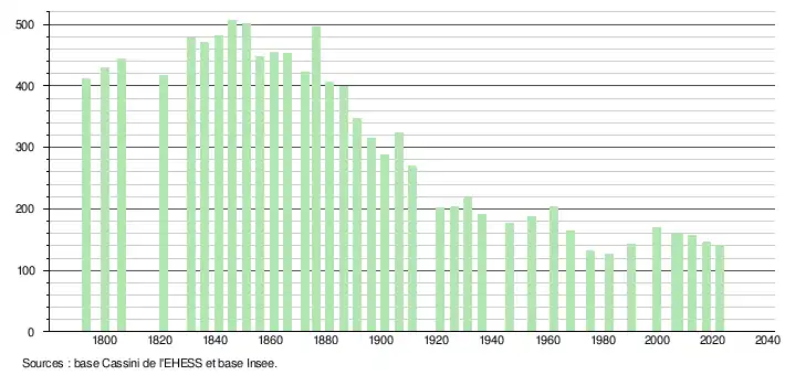 L'évolution du nombre d'habitants est connue à travers les recensements de la population effectués dans la commune depuis 1793. Pour les communes de moins de 10 000 habitants, une enquête de recensement portant sur toute la population est réalisée tous les cinq ans, les populations de référence des années intermédiaires étant quant à elles estimées par interpolation ou extrapolation[15]. Pour la commune, le premier recensement exhaustif entrant dans le cadre du nouveau dispositif a été réalisé en 2007[16].