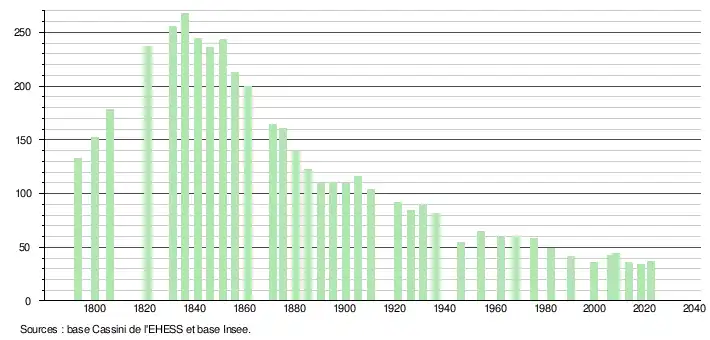 L'évolution du nombre d'habitants est connue à travers les recensements de la population effectués dans la commune depuis 1793. Pour les communes de moins de 10 000 habitants, une enquête de recensement portant sur toute la population est réalisée tous les cinq ans, les populations de référence des années intermédiaires étant quant à elles estimées par interpolation ou extrapolation[15]. Pour la commune, le premier recensement exhaustif entrant dans le cadre du nouveau dispositif a été réalisé en 2008[16].