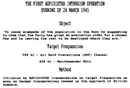 Les émetteurs radio allemands cessaient d'émettre lors d'attaques aériennes alliées dans le but d'empêcher les bombardiers de s'en servir comme aide à la navigation aérienne. Cependant, plusieurs émetteurs, disséminés un peu partout sur le territoire contrôlé par les Allemands, étaient connectés au même réseau et émettaient le même contenu. Quand l'une des stations allemandes ciblées cessaient d'émettre, Aspidistra prenait le relais en émettant sur la fréquence de la station, commençant par retransmettre le contenu reçu de stations allemandes encore en activité. Par la suite, dans un but de tromperie, de la propagande en faveur des Alliés et de fausses affirmations étaient insérées dans la communication. La première « intrusion » de ce type fut réalisée le 25 mars 1945, tel que le montre l'ordre de mission à la droite.
