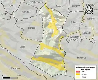 Le retrait-gonflement des sols argileux est susceptible d'engendrer des dommages importants aux bâtiments en cas d’alternance de périodes de sécheresse et de pluie. 26,8 % de la superficie communale est en aléa moyen ou fort (44,5 % au niveau départemental et 48,5 % au niveau national). Sur les 113 bâtiments dénombrés sur la commune en 2019, 62 sont en aléa moyen ou fort, soit 55 %, à comparer aux 75 % au niveau départemental et 54 % au niveau national. Une cartographie de l'exposition du territoire national au retrait gonflement des sols argileux est disponible sur le site du BRGM[35],[Carte 3].
