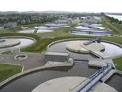 Vue des bassins biologiques et de décantation de la station d'épuration de Oupeye.