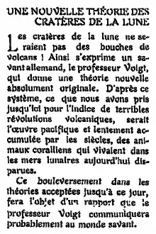 Les cratères lunaires ont reçu différentes interprétations au cours des siècles : récif corallien, anneaux de glace selon la doctrine de la glace éternelle d'Hans Hörbiger, cyclones[1], trous creusés par les sélénites selon Johannes Kepler, volcanisme selon l’Astronomie populaire de François Arago ou Camille Flammarion[2].
