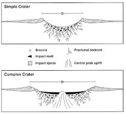 La nature du cratère ne passe pas directement d'un cratère simple à un cratère complexe à pic central. La transition se fait progressivement. De même, lorsque le diamètre final est supérieur à[12] :