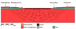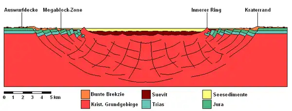 Une deuxième ligne circulaire de collines se trouve à l'intérieur du cratère. La base de ces collines se compose de granit et d'autres roches magmatiques désagrégées sous forme de sable. On trouve occasionnellement des cônes de percussion qui se sont formés juste après l'impact de la météorite. L'anneau central provient du dépôt des roches après le rebond. Le sous-sol cristallin se trouve à 300 ou 400 m dessous. La même configuration se retrouve également au cratère de Steinheim.