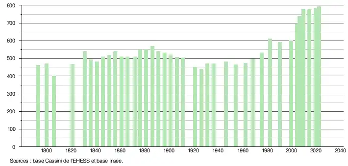 L'évolution du nombre d'habitants est connue à travers les recensements de la population effectués dans la commune depuis 1793. Pour les communes de moins de 10 000 habitants, une enquête de recensement portant sur toute la population est réalisée tous les cinq ans, les populations de référence des années intermédiaires étant quant à elles estimées par interpolation ou extrapolation[20]. Pour la commune, le premier recensement exhaustif entrant dans le cadre du nouveau dispositif a été réalisé en 2004[21].