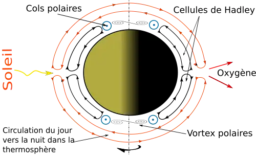 L'air chaud remonte au niveau de l'équateur, là où le réchauffement solaire se concentre, et afflue aux pôles. Ce phénomène est appelé cellules de Hadley. Toutefois, ce phénomène ne se manifeste qu'en deçà de ±60° de latitude. Là, l'air commence à redescendre vers l'équateur sous les nuages. Cette interprétation de la circulation de l'air est prouvée par la distribution du monoxyde de carbone aux alentours de ±60° de latitude. Plus au nord, un autre type de circulation est observé. Il y a, au niveau des latitudes comprises entre 60° et 70°, des « cols polaires »[5]. Ils sont caractérisés par des températures allant de 30 à 40 K, ce qui est relativement bas par rapport à d'autres latitudes[5]. De telles températures sont probablement dues à un rafraichissement adiabatique[5].
