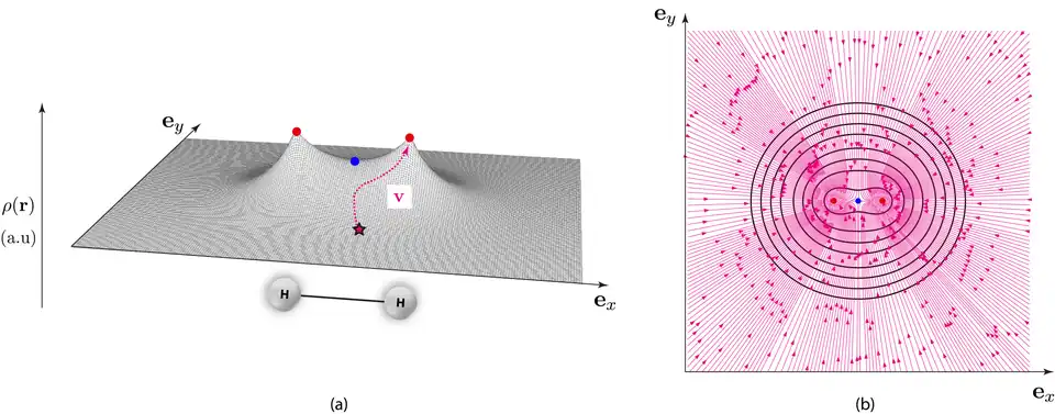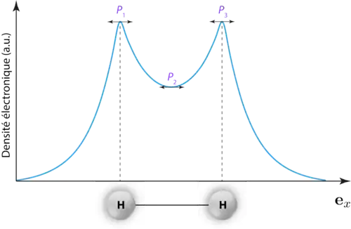 L'approche AIM se base sur l'étude de la topologie de la densité électronique et particulièrement sur celle des points critiques. Mathématiquement, ces derniers, de coordonnées représentent chacun un point dans l'espace en trois dimensions pour lesquels chacune des composantes du gradient de la densité électronique s'annule :Cette dernière définition implique donc qu'un point critique est un point de la densité électronique correspondant localement soit à un minimum, soit à un maximum de la densité électronique, pouvant être associé à une situation chimique donnée. Ce lien peut très facilement être illustré dans le cas de la molécule de dihydrogène (figure 1) :