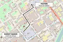 La police finlandaise indique dans un communiqué[13] avoir été alertée à 16 h 2, à 16 h 5, à Puutori, la police ordonne au suspect de s'immobiliser, celui-ci n'obéissant pas, les policiers lui tirent dans les cuisses[14],[15],[13].