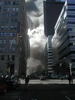 Atteint par des débris métalliques chauds projetés sur sa face sud (en son tiers oriental) lors de l'effondrement de la tour Nord, le WTC 7, gratte-ciel de quarante-sept étages, était la proie de quelques incendies, avec des flammes sporadiquement et partiellement visibles (niveaux 11 à 13 et 28 à 30)[52]. En août 2008, le NIST a publié un rapport concernant l'effondrement de WTC 7[52], concluant que le feu en était la cause principale.
