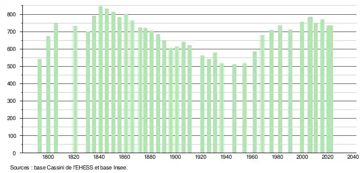 L'évolution du nombre d'habitants est connue à travers les recensements de la population effectués dans la commune depuis 1793. Pour les communes de moins de 10 000 habitants, une enquête de recensement portant sur toute la population est réalisée tous les cinq ans, les populations de référence des années intermédiaires étant quant à elles estimées par interpolation ou extrapolation[42]. Pour la commune, le premier recensement exhaustif entrant dans le cadre du nouveau dispositif a été réalisé en 2005[43].