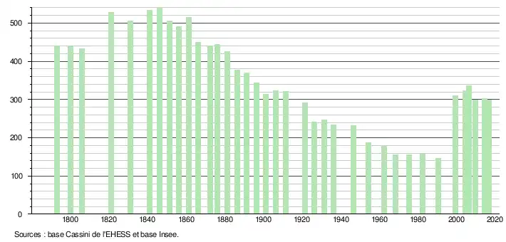 L'évolution du nombre d'habitants est connue à travers les recensements de la population effectués dans la commune depuis 1793. Pour les communes de moins de 10 000 habitants, une enquête de recensement portant sur toute la population est réalisée tous les cinq ans, les populations de référence des années intermédiaires étant quant à elles estimées par interpolation ou extrapolation[17]. Pour la commune, le premier recensement exhaustif entrant dans le cadre du nouveau dispositif a été réalisé en 2004[18].