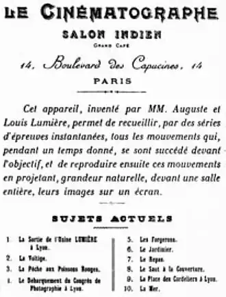 Contrairement à une idée reçue plus que tenace, les frères Lumière n'ont pas réalisé les premiers films du cinéma, mais la première projection collective gratuite de films photographiques sur grand écran, le , devant un parterre restreint de savants de la Société d'encouragement pour l'industrie nationale, au n° 44 de la rue de Rennes, correspondant désormais au 4 place Saint-Germain-des-Prés à Paris. Suivent les séances du et du au Palais Lumière et à l'Eden Théâtre de La Ciotat[10], devant un public choisi, et enfin la séance payante ouverte au grand public du au Salon indien du Grand Café situé 14 boulevard des Capucines à Paris. Chacun des dix bobineaux projetés lors de cette séance dure une cinquantaine de secondes. Avec L'Arroseur arrosé, Louis Lumière réalise le premier film photographique de fiction.