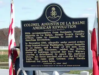 En 1780, ils auraient été sous les ordres secrets du général Washington, mais agissant probablement de son propre chef, il a voyagé vers le bas de la rivière Ohio à Kaskaskia. Le succès de George Rogers Clark sur Fort Sackville à Vincennes, a inspiré de La Balme à tenter un exploit similaire contre les Britanniques à Fort Détroit. La Balme est arrivé à Kaskaskia comme officier français et a été "accueilli comme Messie" par les riverains Canadiens, qui avaient vécu sous la domination britannique pendant plus d'une décennie. Il a rassemblé une liste de griefs de résidents vivant sous la domination des Britanniques, qui devait être remise à l'ambassadeur de France à Fort Pitt[7].