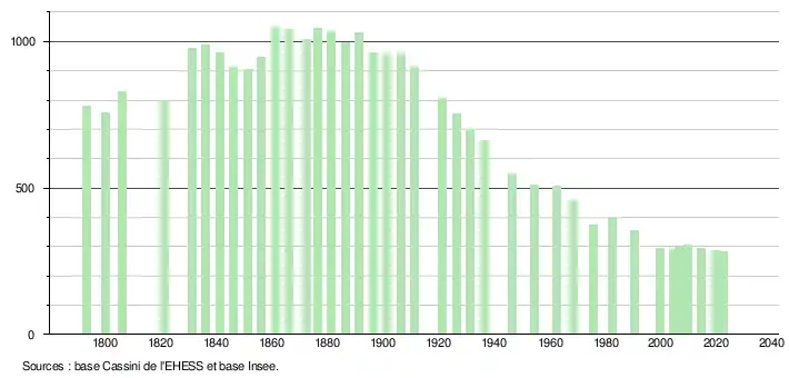 L'évolution du nombre d'habitants est connue à travers les recensements de la population effectués dans la commune depuis 1793. Pour les communes de moins de 10 000 habitants, une enquête de recensement portant sur toute la population est réalisée tous les cinq ans, les populations de référence des années intermédiaires étant quant à elles estimées par interpolation ou extrapolation[20]. Pour la commune, le premier recensement exhaustif entrant dans le cadre du nouveau dispositif a été réalisé en 2004[21].
