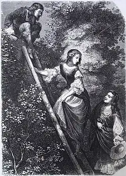 Aure de Montalais et Malicorne surpris par Saint-Aignan. Illustration ornant une édition du roman d'Alexandre Dumas, Le Vicomte de Bragelonne, Paris, 1852.