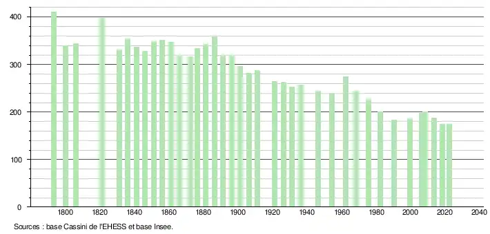 L'évolution du nombre d'habitants est connue à travers les recensements de la population effectués dans la commune depuis 1793. Pour les communes de moins de 10 000 habitants, une enquête de recensement portant sur toute la population est réalisée tous les cinq ans, les populations de référence des années intermédiaires étant quant à elles estimées par interpolation ou extrapolation[20]. Pour la commune, le premier recensement exhaustif entrant dans le cadre du nouveau dispositif a été réalisé en 2008[21].