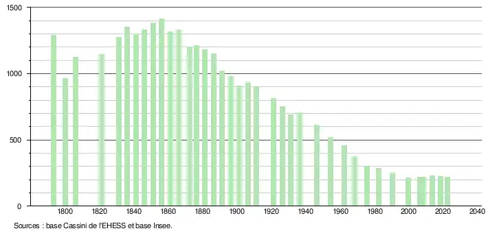 | L'évolution du nombre d'habitants est connue à travers les recensements de la population effectués dans la commune depuis 1793. Pour les communes de moins de 10 000 habitants, une enquête de recensement portant sur toute la population est réalisée tous les cinq ans, les populations de référence des années intermédiaires étant quant à elles estimées par interpolation ou extrapolation[25]. Pour la commune, le premier recensement exhaustif entrant dans le cadre du nouveau dispositif a été réalisé en 2008[26]. En 2022, la commune comptait 219 habitants[Note 3], en évolution de −5,19 % par rapport à 2016 (Corrèze : −0,59 %, France hors Mayotte : +2,11 %). |
