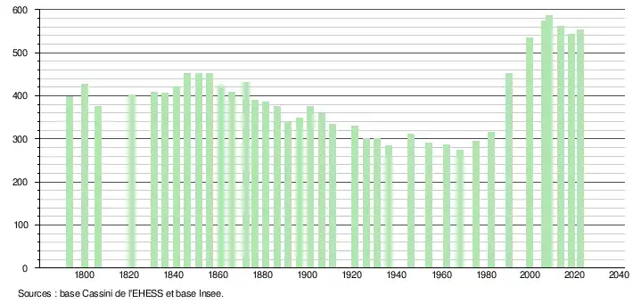 L'évolution du nombre d'habitants est connue à travers les recensements de la population effectués dans la commune depuis 1793. Pour les communes de moins de 10 000 habitants, une enquête de recensement portant sur toute la population est réalisée tous les cinq ans, les populations de référence des années intermédiaires étant quant à elles estimées par interpolation ou extrapolation[22]. Pour la commune, le premier recensement exhaustif entrant dans le cadre du nouveau dispositif a été réalisé en 2008[23].