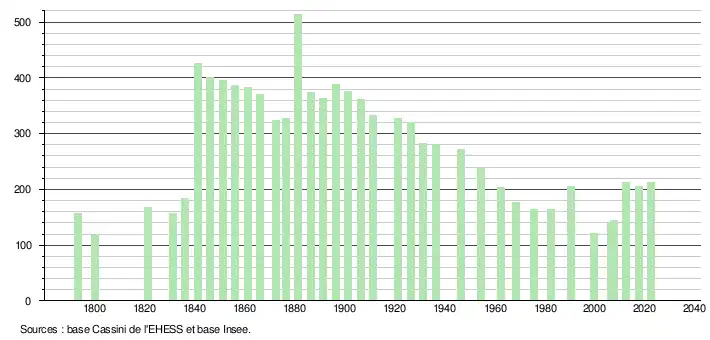 - ↑ Population municipale de référence en vigueur au 1er janvier 2025, millésimée 2022, définie dans les limites territoriales en vigueur au 1er janvier 2024, date de référence statistique : 1er janvier 2022.