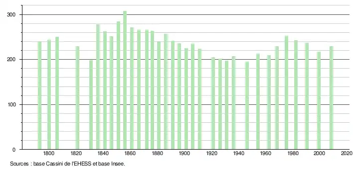 - ↑ Par convention dans Wikipédia, le principe a été retenu de n’afficher dans le tableau des recensements et le graphique, pour les populations légales postérieures à 1999, que les populations correspondant à une enquête exhaustive de recensement pour les communes de moins de 10 000 habitants, et que les populations des années 2006, 2011, 2016, etc. pour les communes de plus de 10 000 habitants, ainsi que la dernière population légale publiée par l’Insee pour l'ensemble des communes.
