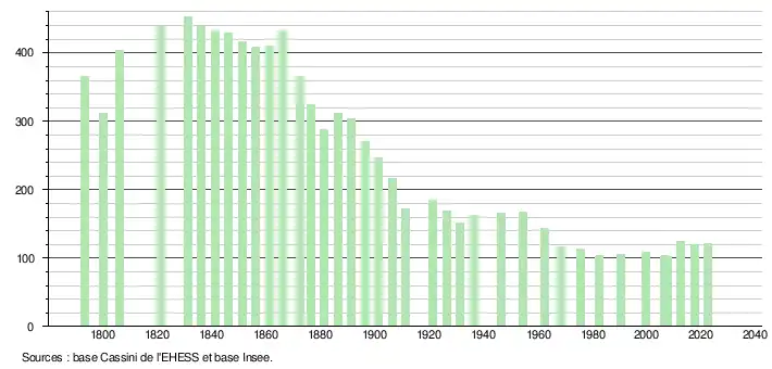 L'évolution du nombre d'habitants est connue à travers les recensements de la population effectués dans la commune depuis 1793. Pour les communes de moins de 10 000 habitants, une enquête de recensement portant sur toute la population est réalisée tous les cinq ans, les populations de référence des années intermédiaires étant quant à elles estimées par interpolation ou extrapolation[28]. Pour la commune, le premier recensement exhaustif entrant dans le cadre du nouveau dispositif a été réalisé en 2007[29].