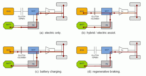 • en phase de décélération ou de descente, le freinage régénératif permet au moteur/générateur électrique de convertir une partie de l'énergie cinétique en énergie électrique, rechargeant la batterie. Ce rôle de frein moteur peut être accru en couplant en outre le moteur thermique aux roues, le forçant à tourner sans injection de carburant et soulageant ainsi encore les freins à friction. Si le freinage électrique seul est suffisant, le moteur thermique est débrayé et arrêté[réf. souhaitée].
