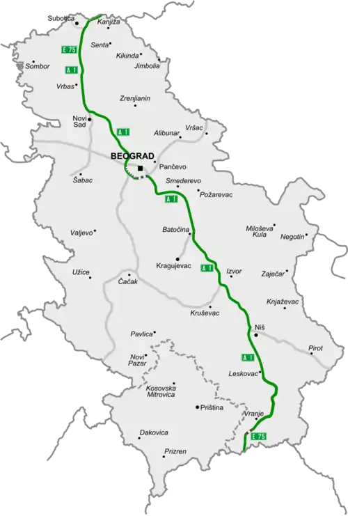L’autoroute A1 (en serbe : Државни пут ІА реда А1, Državni put IA reda A1 ; Ауто-пут А1, Auto-put A1) est une autoroute majeure de Serbie qui relie entre elles les frontières serbo-hongroise et serbo-macédonienne (Nord / Sud) passant près des villes de Subotica, Novi Sad, la capitale Belgrade, Niš, Leskovac et Vranje. Elle est également appelée « E75 » ou « Corridor 10 »[1]. Avec ses 583 kilomètres, c'est la plus longue autoroute de Serbie. Cette autoroute fait partie de la route européenne 75. La dernière section du Périphérique de Belgrade, entre le Tunnel de Straževica et l'échangeur de Bubanj Potok est mis en circulation fin [2].