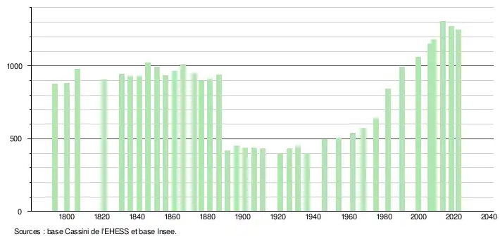 L'évolution du nombre d'habitants est connue à travers les recensements de la population effectués dans la commune depuis 1793. Pour les communes de moins de 10 000 habitants, une enquête de recensement portant sur toute la population est réalisée tous les cinq ans, les populations de référence des années intermédiaires étant quant à elles estimées par interpolation ou extrapolation[36]. Pour la commune, le premier recensement exhaustif entrant dans le cadre du nouveau dispositif a été réalisé en 2008[37].