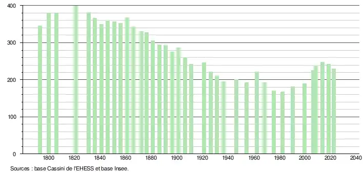 L'évolution du nombre d'habitants est connue à travers les recensements de la population effectués dans la commune depuis 1793. Pour les communes de moins de 10 000 habitants, une enquête de recensement portant sur toute la population est réalisée tous les cinq ans, les populations de référence des années intermédiaires étant quant à elles estimées par interpolation ou extrapolation[17]. Pour la commune, le premier recensement exhaustif entrant dans le cadre du nouveau dispositif a été réalisé en 2008[18].