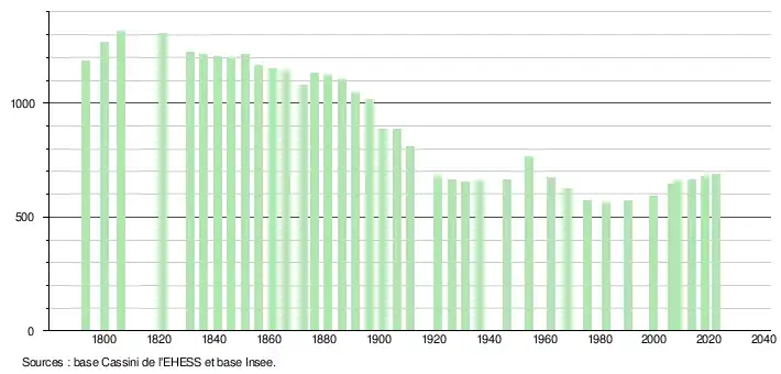 L'évolution du nombre d'habitants est connue à travers les recensements de la population effectués dans la commune depuis 1793. Pour les communes de moins de 10 000 habitants, une enquête de recensement portant sur toute la population est réalisée tous les cinq ans, les populations de référence des années intermédiaires étant quant à elles estimées par interpolation ou extrapolation[27]. Pour la commune, le premier recensement exhaustif entrant dans le cadre du nouveau dispositif a été réalisé en 2008[28].