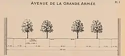 La butte a donc été arasée de plus de 5 m pour avoir une pente accessible aux véhicules et pour créer une longue perspective face au palais des Tuileries. Cette avenue, alors située en pleine campagne et non bâtie, resta longtemps un lieu de promenades attenant au bois de Boulogne. Huit allées rayonnantes furent arborées en 1724, sous la surintendance du duc d'Antin, comme on peut les voir sur le plan de Trudaine établi en 1746[1]. L'avenue de la Grande Armée, dite route de Neuilly ,fut donc ouverte sous Louis XVI avec dès l'origine sa largeur actuelle de 70 m en continuation de la perspective grandiose des Tuileries à l'Étoile.