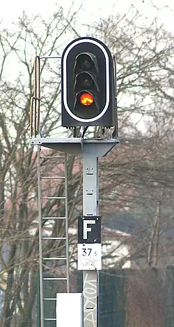 - ↑ En fait, le feu jaune de l'avertissement est toujours situé, de cette façon, sur tous les panneaux. Par contre, dans le cas du Disque, un deuxième feu jaune est implanté à la même hauteur que le feu rouge (Bien entendu, l'"indication disque présenté" bloque, techniquement, tout allumage accidentel du feu jaune de l'avertissement)