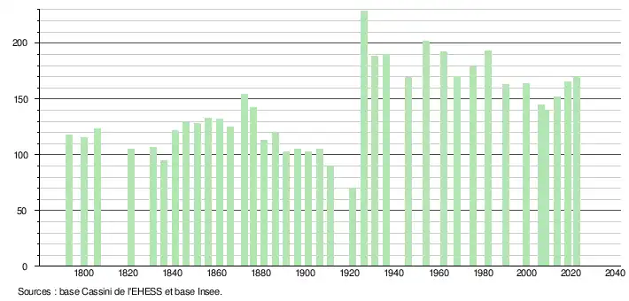 L'évolution du nombre d'habitants est connue à travers les recensements de la population effectués dans la commune depuis 1793. Pour les communes de moins de 10 000 habitants, une enquête de recensement portant sur toute la population est réalisée tous les cinq ans, les populations de référence des années intermédiaires étant quant à elles estimées par interpolation ou extrapolation[30]. Pour la commune, le premier recensement exhaustif entrant dans le cadre du nouveau dispositif a été réalisé en 2008[31].