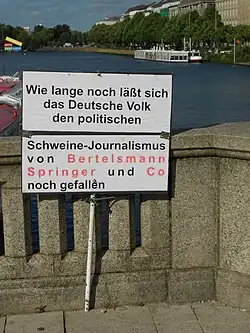 Panneaux des Vigiles pour la paix critiquant les grands groupes médiatiques allemand comme Bertelsmann et Axel Springer en juin 2014